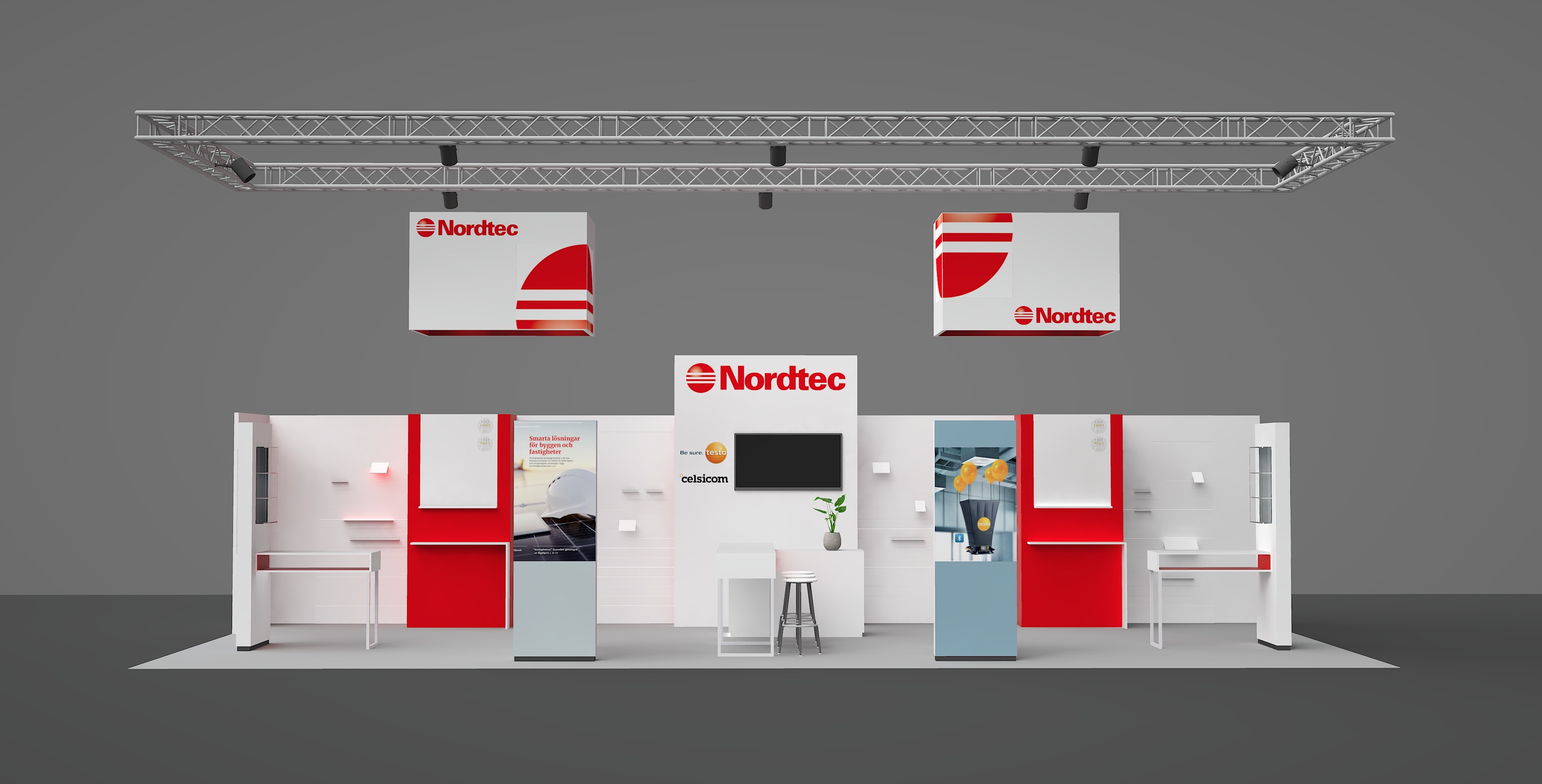 Nordtec behövde förnya sitt monterkoncept inför årets Nordbyggmässa. Några befintliga element byggdes om och återanvändes. Däremot skulle hela bakväggen med produktexponering bytas ut. Lösningen blev väggar med spårpaneler och specialtillverkade hyllor för de olika instrumenten vilket gav stor flexibilitet. Små förrådsutrymmen skapade dynamik samt erbjöd bra förvaring - en bra lösning som motsvarade kundens önskemål.