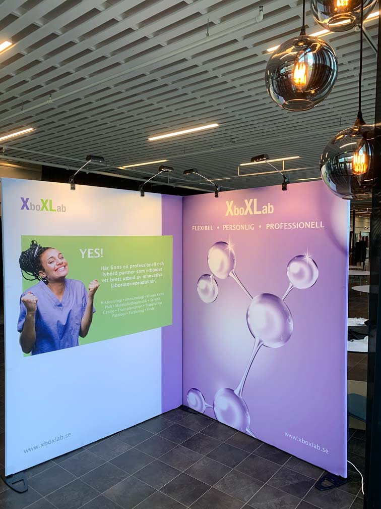 Portabel monterXboXLab deltar på ett flertal mässor och kongresser varje år och hade behov av ett hållbart, flexibelt och mer enhetligt system. Vi valde Grand Fabric från Expand som består av vikbara aluminiumramar med tyger. De hade önskemål om att grafiken skulle kännas glad och inbjudande och det kändes givet att använda sig av deras färgprofil för att förstärka varumärket.